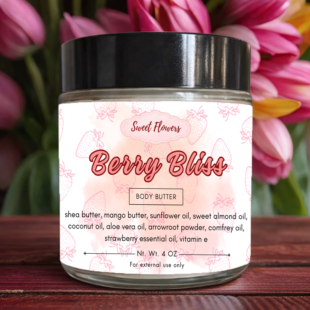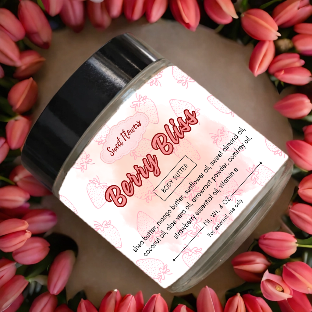 Indulge your skin in the luscious, fruity goodness of Berry Bliss Body Butter. This rich, velvety blend is packed with ultra-nourishing butters and oils to deeply hydrate and soften your skin, leaving it silky smooth with a radiant glow. Infused with the irresistible scent of ripe strawberries, Berry Bliss is a sweet treat for your senses and your skin.