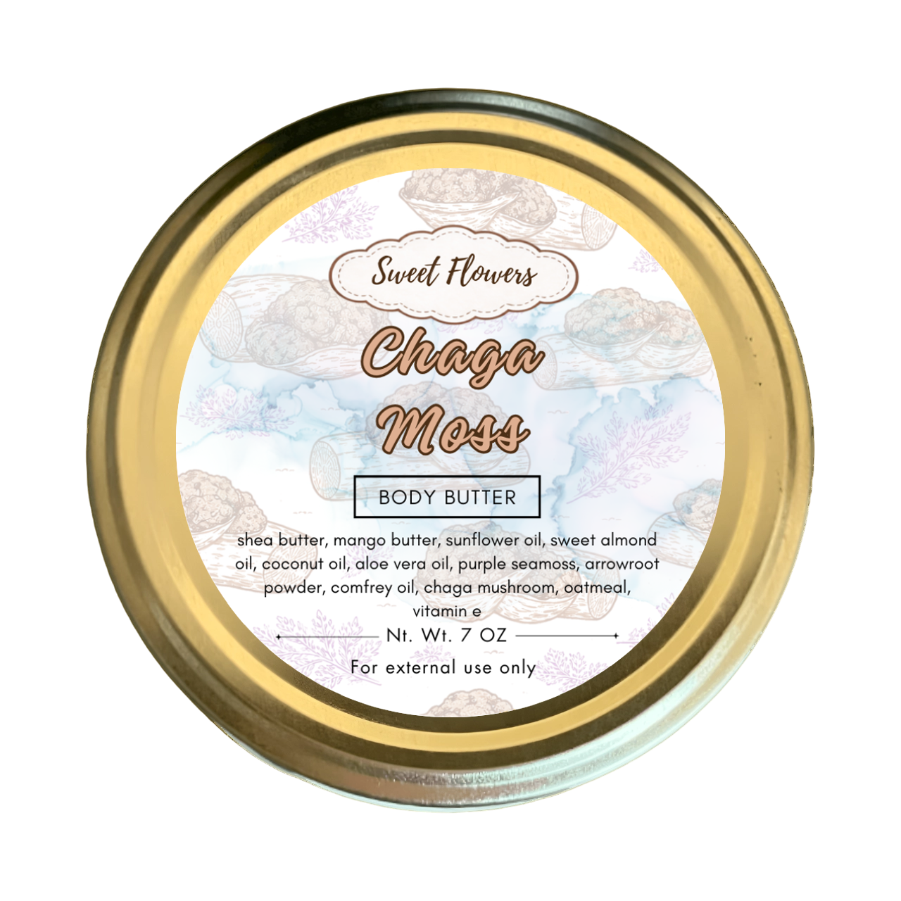 Mango Butter, Coconut Oil, Sweet Almond Oil, Purple Sea Moss, Chaga Mushroom, Arrowroot Powder