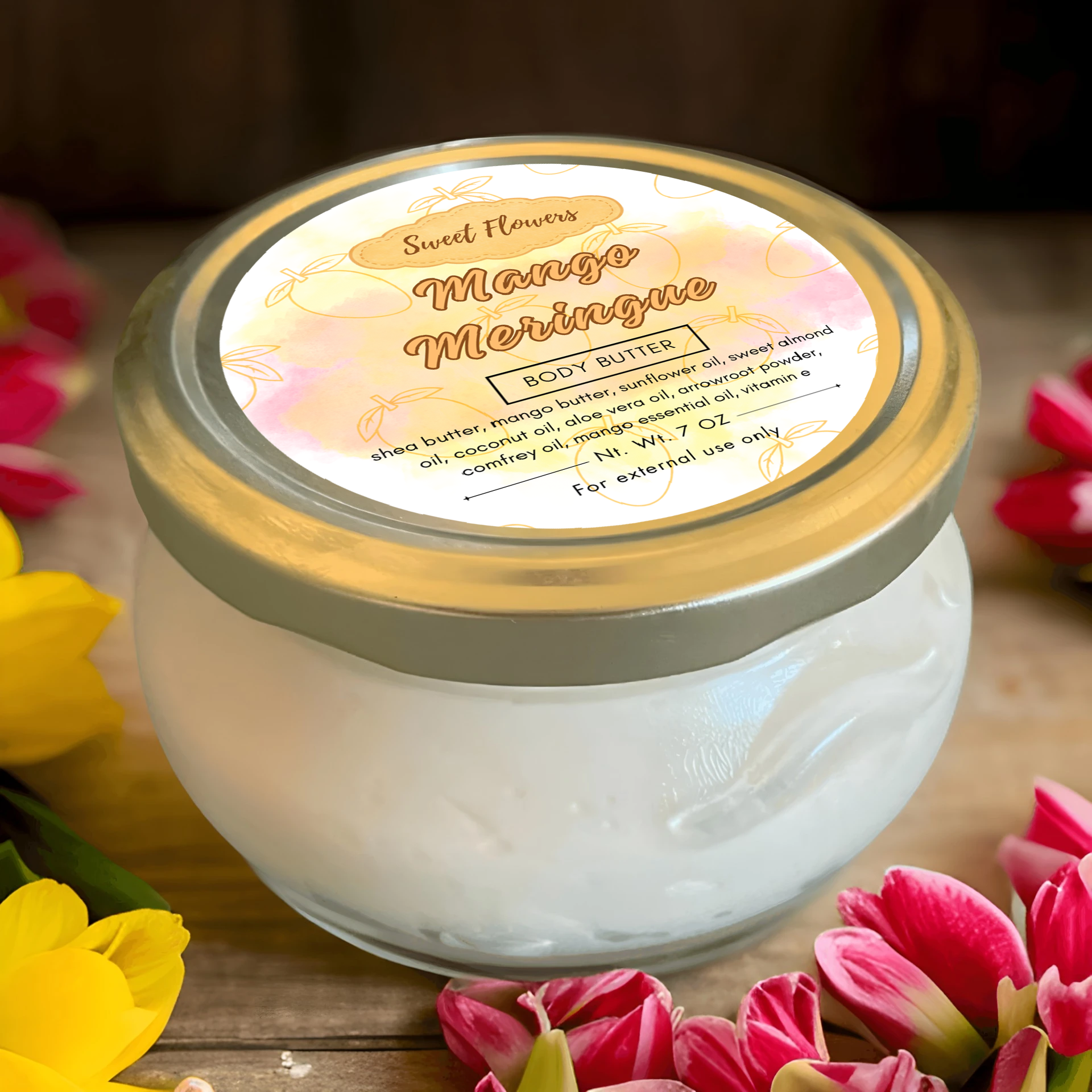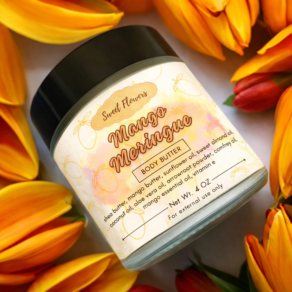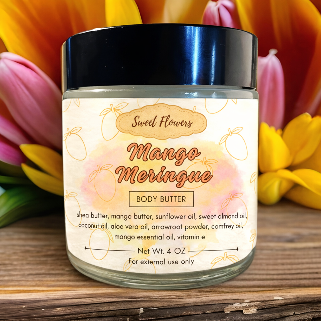 Treat your skin to the velvety softness of Mango Meringue Body Butter, a lightweight yet deeply nourishing blend infused with the tropical essence of ripe mangoes. This luxurious formula melts effortlessly into your skin, delivering lasting hydration with a silky, non-greasy feel.